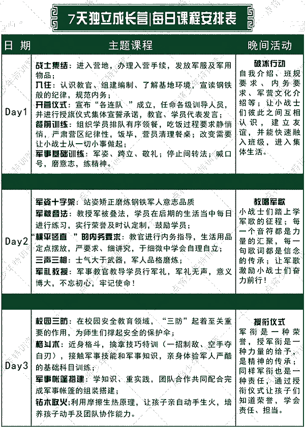 ★由于营期时间过长,具体课程执行情况根据天气情况和班级营员体质情况等外在因素进行相应调整,不做另行通知。