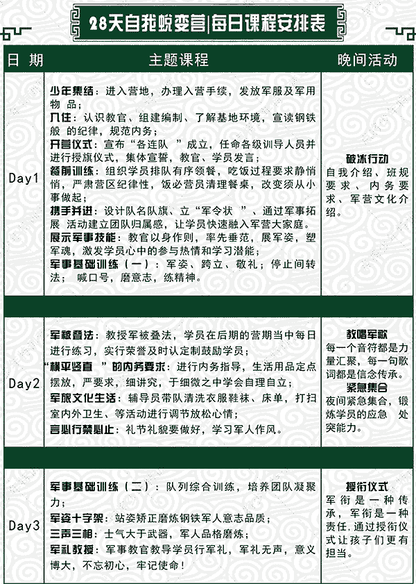 3、开营前一周内取消行程,可无损改期。如需退营,报名费不予退还。