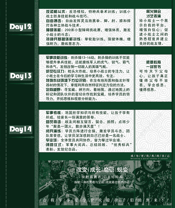 3、开营前一周内取消行程,可无损改期。如需退营,报名费不予退还。