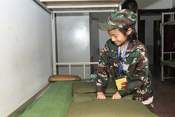 上午:军人形象:叠方块被,物品摆放与整理;拓展游戏:进化论;木兰精神:勇闯障碍赛