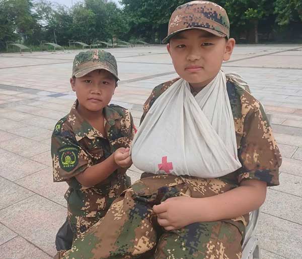 上午:军事技能:旗语操(一);战场救护:骨折固定、包扎止血