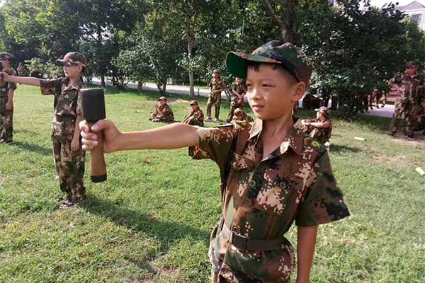 下午:军事训练:停止间转法,蹲下起立;军事武器:手榴弹的讲解与投掷;军事拓展:我们是最棒的团队