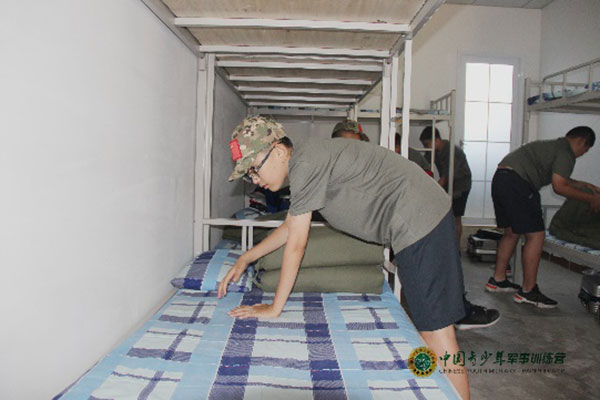 ☆体验军旅生活:要求学员定时起床,操练,用餐,就寝,军容须整洁,站有站相,坐有坐相,走路要挺要走直线,内务须横平竖直(豆腐块被子的叠法);