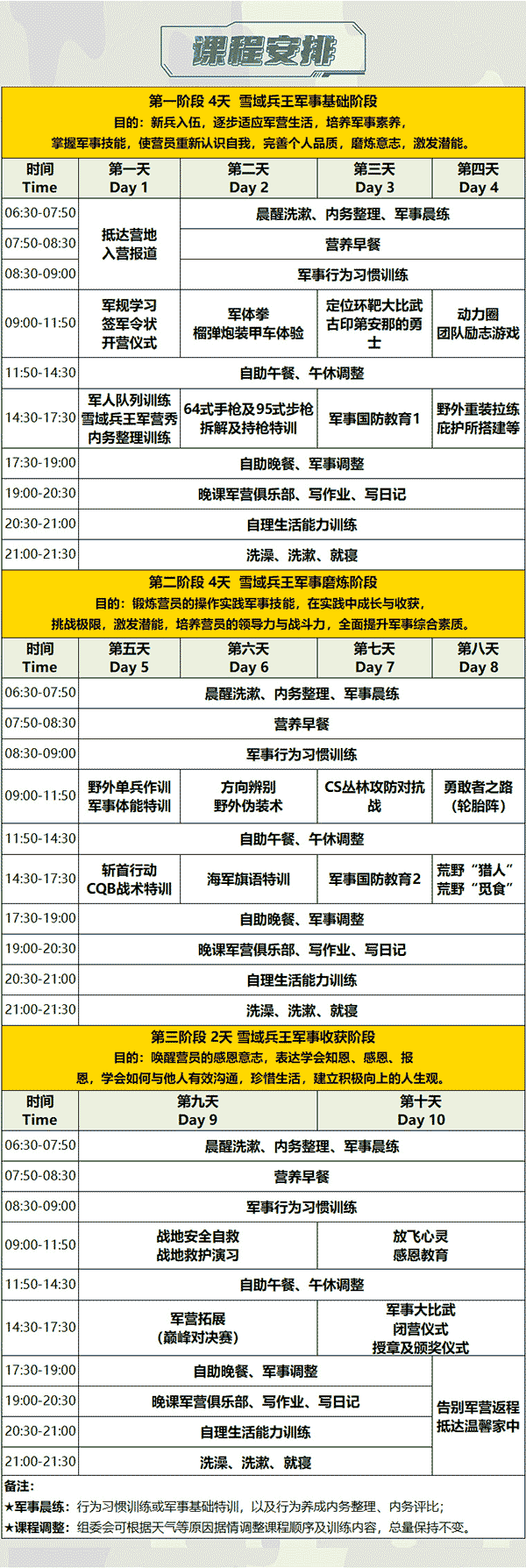 1、学员须严格遵守营地规章、纪律和作息时间,以保证每天有充沛的精力参加军事训练和其他各项训练;