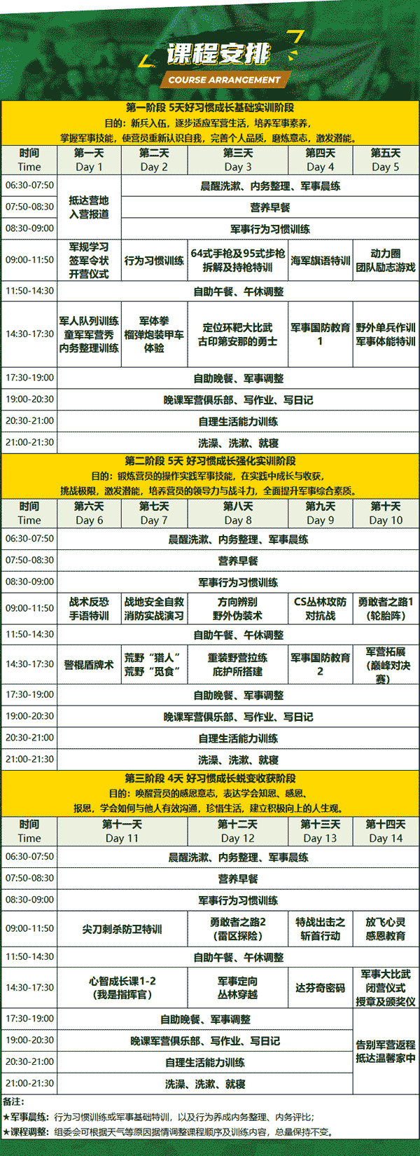 14天“好习惯成长”特训军事蜕变营是军事课程体系中极具前沿、高效,并具操作性的军事课程线路。全方位军事主题课程的设计、进阶式行程的安排都是很丰富、很精彩的,让孩子度过一个开心、收获、难忘的假期!