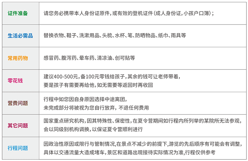 费用明细:营费包含营期内的餐饮费、住宿费、外出交通费用、课程及资料费用、服装费用、入营礼包费用、保险费用等