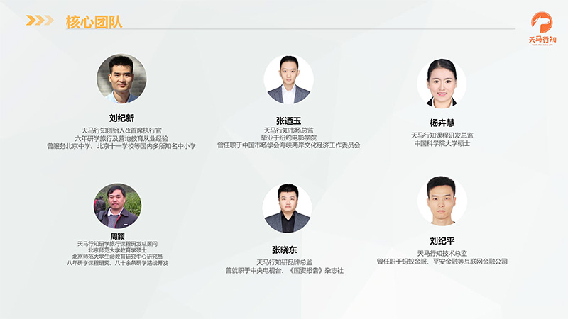 天马行知(北京)是国内研学旅行和营地教育专业平台,以儿童发展心理学和体验教育为理论支撑,为6-18岁青少年甄选高品质的研学旅行、营地教育课程和综合实践活动;通过大数据及人工智能技术创新,挖掘青少年成长中所需素质能力,为家长和学校了解孩子的成长发展提供参考,推动学生、家长、学校、社会机构四方联动,让每个孩子都有梦想且有能力实现,培养面对未来世界的能力。
