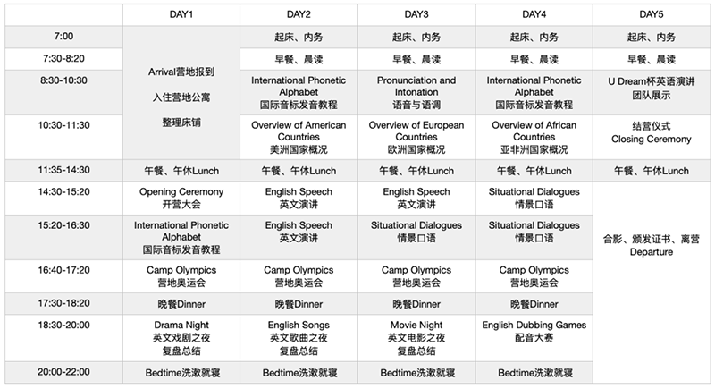 为孩子们打造全英文的语言环境,随时随地把英语脱口而出!激情的英语发音口语课堂,让营员学习流利标准的英语发音,语调训练,节奏训练,连读略读训练,英语思维,美式课堂,文化体验,英语演讲,唇枪舌辩,素质拓展,在活动和游戏过程中口语狂轰滥炸!6天5夜英语浸泡,把英语彻底说出来!