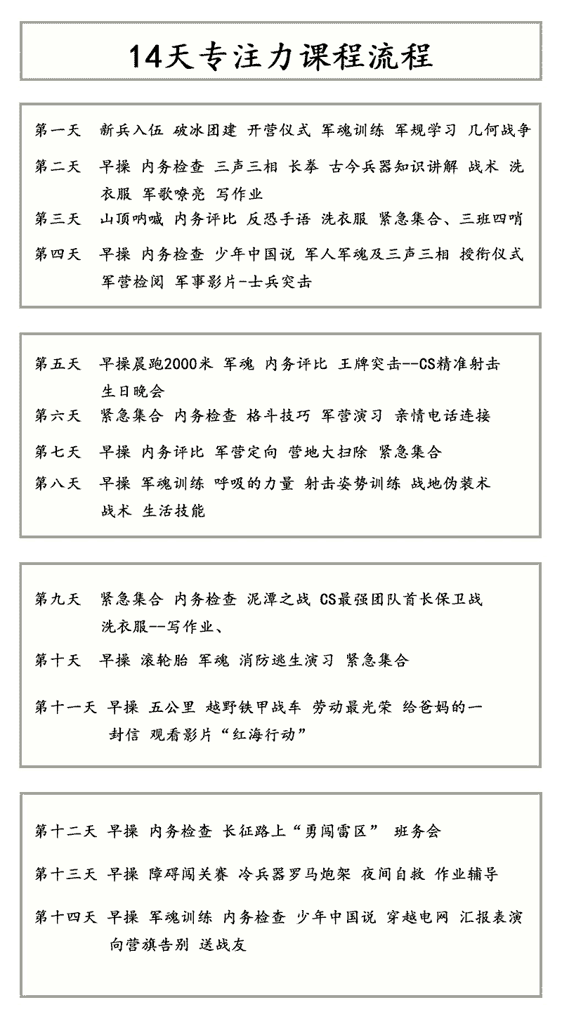 ☆部队服役5年以上,接受过专业青少年素质教育的教练团队;