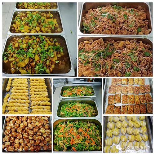 按学校食堂卫生标准供应饭菜,科学荤素搭配,营养丰富,据天气变化灵活调整汤品和饮品,自助形式。