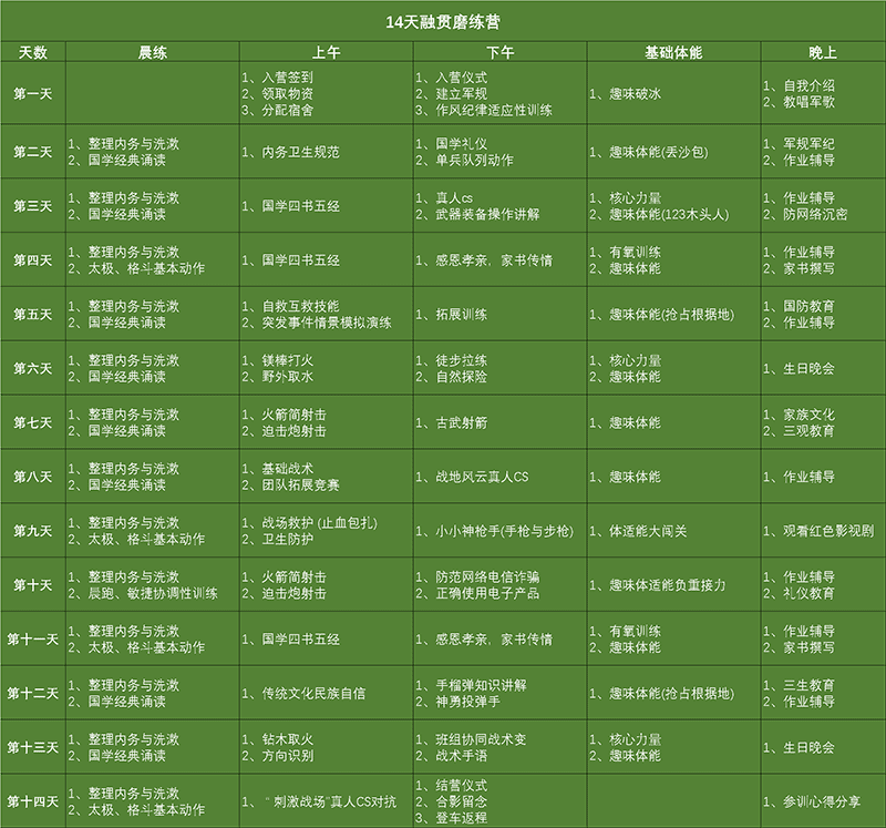 1、军营文化:行为习惯(帮助孩子改掉拖沓懒散、自由散漫、专注力差、自控力差等不良习惯;增强体质、锤炼意志,培养孩子独立、坚强、自信、勇敢等优秀军人品格。)