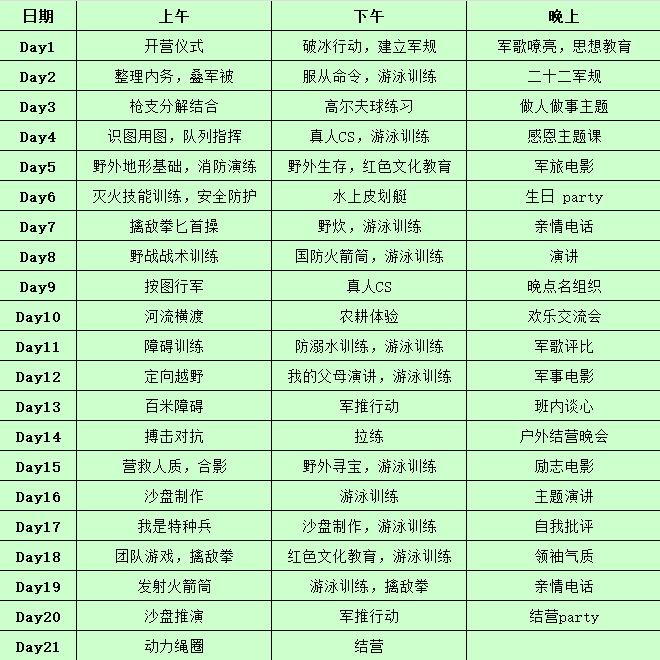 7.活动期间采用全封闭式军事化管理,营员统一食宿,教官与学员们同吃同住,活动期间不安排家长探视,有特殊原因,请提前联系;