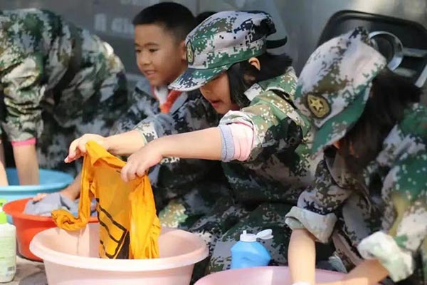 晚间活动:教唱军歌:辅导员指导学员们进行衣物清洗晾晒,自己的事情自己动手做。